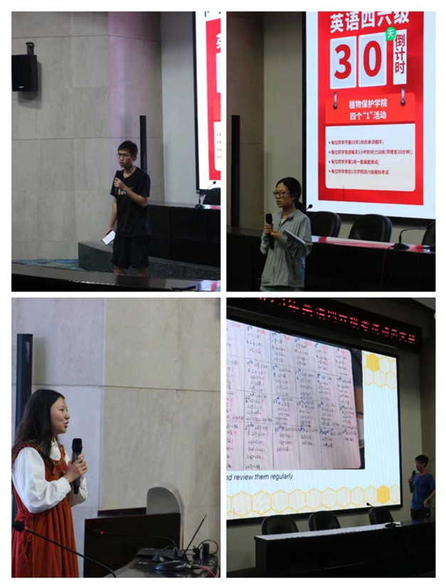 此次动员大会还请了刘金汪、赵月盈、冯李仲良、杨珺淇,4名在四六级考试中取得优异成绩的同学分享了经验。四位同学结合自身高分经验,梳理并分享了各类题型的解决思路和方法,为备考同学提供经验借鉴好学习参考。