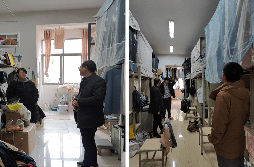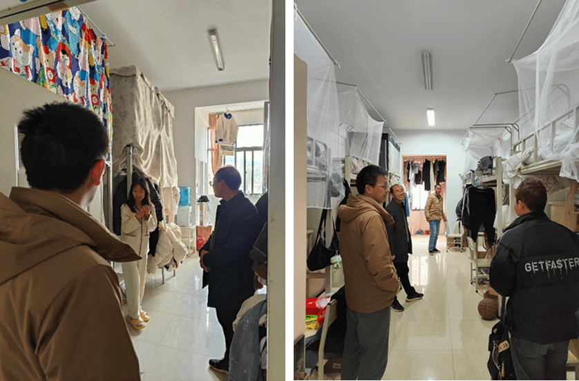 到达宿舍后,各位老师观察宿舍内环境,询问同学们近期学习和生活情况,了解其是否存在困难和问题,以及返乡过春节的计划和假期的打算。通过交流,低年级研究生表示,希望能在春节前抓紧时间做实验,以完成现阶段实验任务。高年级研究生则希望能在春节前抓紧时间完成论文试验,及时撰写毕业论文。待提交毕业论文初稿后,就返乡过春节并准备相关考试、企业应聘材料等就业事宜。