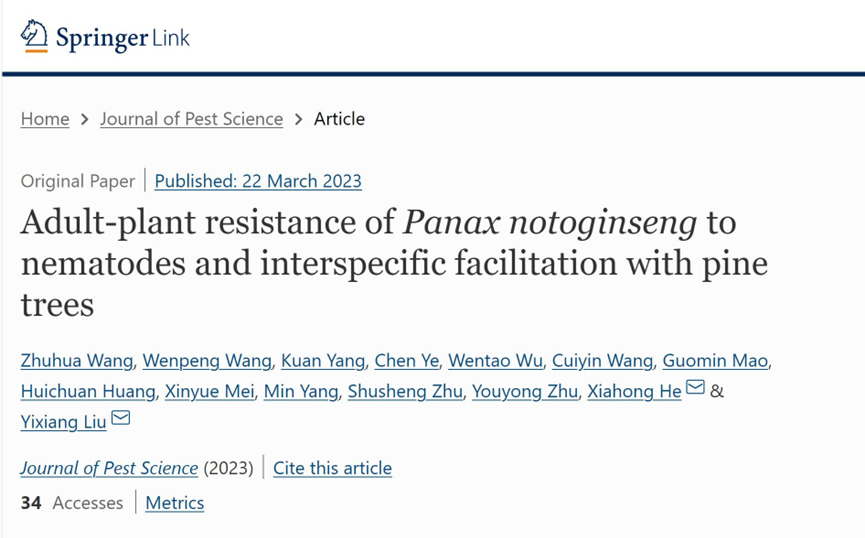 and interspecific facilitation with pine trees”的研究论文。该论文通过2年的大田试验揭示了三七对线虫危害具有典型的成株抗性(APR),此外,松树-三七间作属于种间互利模式,能够提高三七的生长和品质。