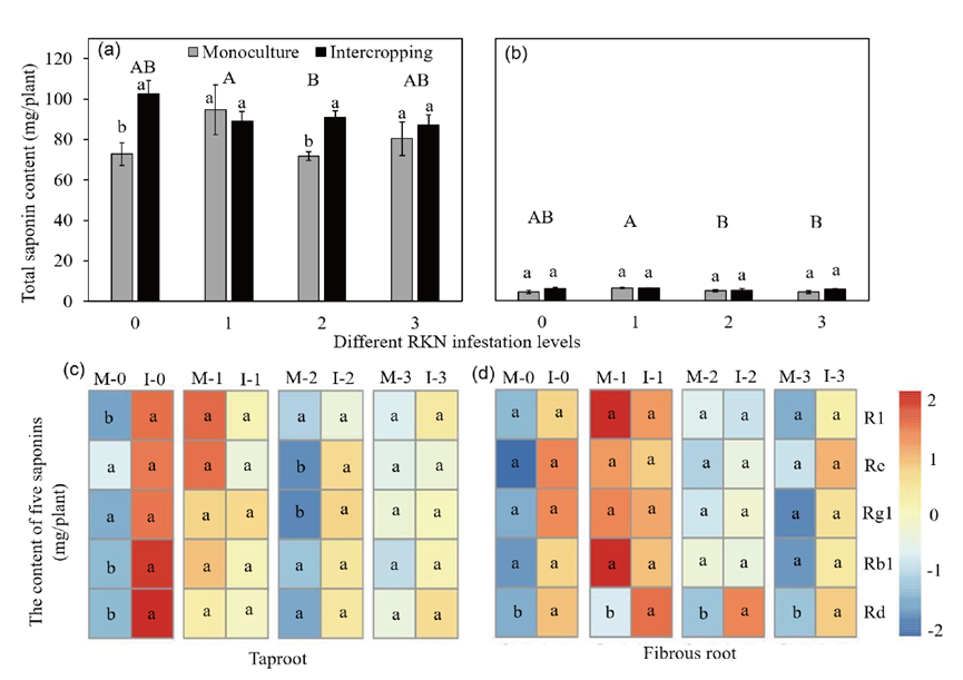 图2间作和单作系统中不同RKN侵染水平下三七主根和须根中的总皂苷和5种活性皂苷含量。(a)主根中的总皂苷含量。(b)须根中的总皂苷含量。(c)、(d)热图分别说明了不同RKN侵染水平下主根和须根中5种活性皂苷的含量。数据的表现形式为平均值和标准误(SEM),不同的小写字母代表相同RKN侵染水平下单作和间作的三七间具有显著的差异(S p<0.05;