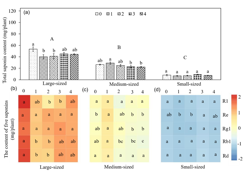 图1不同RKN侵染水平下三七种苗根系总皂苷和5种活性皂苷含量。(a)总皂苷含量。(b)、(c)、(d)热图分别说明了不同RKN侵染水平下大、中、小三七根系中5种活性皂苷的含量。数据的表现形式为平均值和标准误(SEM),不同的小写字母代表相同大小不同RKN侵染水平的三七间具有显著的差异(p < 0.05,LSD)。不同的大写字母代表不同大小的三七间具有显著的差异(p < 0.05,LSD)。