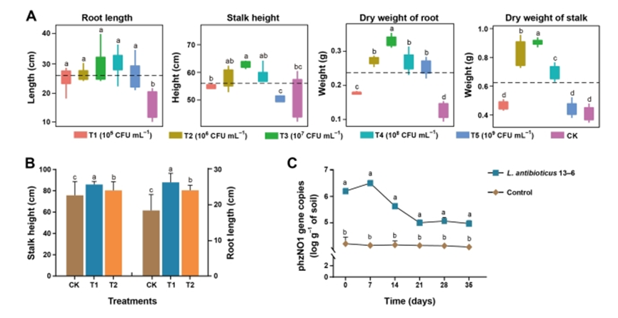 图1.抗生素溶杆菌13-6种衣剂处理促进玉米根系生长和根际定殖