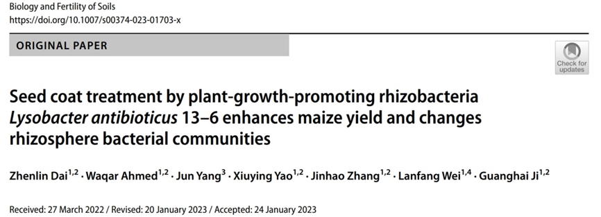 2023年1月24日,伟德bv1946官网姬广海教授团队在国际知名期刊《Biology and Fertility of Soils》(2022,IF = 6.5)上发表题为“Seed coat treatment by plant‑growth‑promoting rhizobacteria Lysobacter antibioticus 13–6 enhances maize yield and changes rhizosphere bacterial communities”的研究论文,该文章揭示了植物促生细菌抗生素溶杆菌Lysobacter antibioticus 13–6,通过玉米种子包衣处理,显著提高田间玉米产量,涉及到玉米种子包衣后影响土壤理化特性、玉米促生和改善玉米根际微生物群落结构网络酸调控玉米产量起到关键作用。