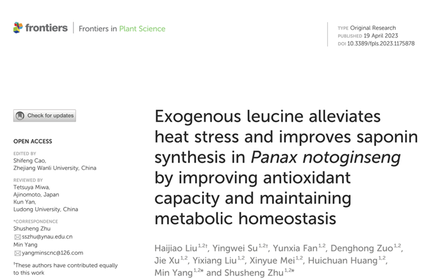 近期,国际知名期刊Frontiers in Plant Science在线发表了伟德bv1946官网朱书生教授团队题为“Exogenous leucine alleviates heat stress and improves saponin synthesis in Panax notoginseng by improving antioxidant capacity and maintaining metabolic homeostasis”的研究论文。该论文通过盆栽、田间试验和代谢组揭示了外源应用亮氨酸缓解三七热胁迫和促进皂苷合成的效应和机制。