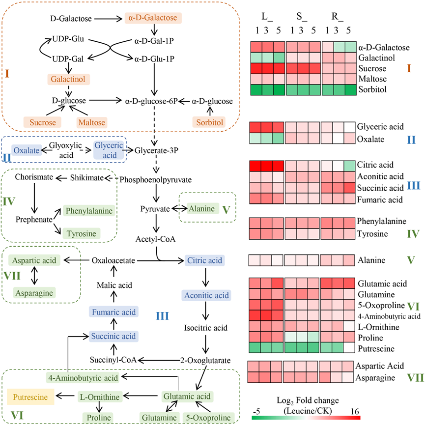 代谢组分析表明,亮氨酸处理增强了三七的氨基酸代谢和碳水化合物代谢。