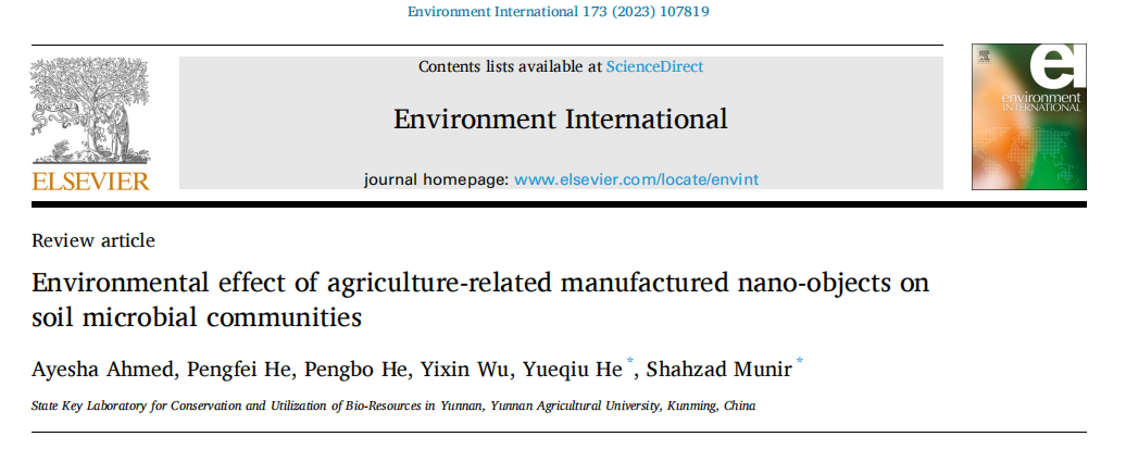 2023年2月10日,伟德bv1946官网何月秋教授团队在环境科学领域高质量期刊 environment international(中国科学院1区,IF=11.8)发表了题为“Environmental effect of agriculture-related manufactured nano-objects on soil microbial communities”的综述论文。该论文系统性综述了与农业相关的人造纳米物对土壤微生物群落的环境影响,提出了与农业相关的纳米制品(MNOs)可以彻底改变作物生产,并有助于实现可持续发展的目标。