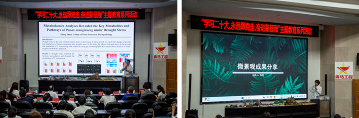 颁奖典礼共向4个赛区、13个奖项的获奖个人及团队颁发奖状,并邀请优秀获奖代表张帅和张恒同学进行成果展示与感悟分享。张帅同学在分享制作学术海报的经验时表示,学术海报的制作要从读者观看的角度出发,竖版较横板更方便读者阅读,优秀的海报是学术成果直观展示的重要载体。张恒表示,其团队能够获得昆虫微景观制作一等奖,离不开个人过硬的专业本领与团队成员的密切配合。同时,优秀的景观作品离不开动手能力的支撑,这是我们将所学知识从理论变为实践的重要步骤。