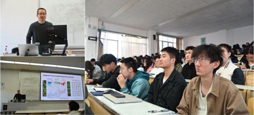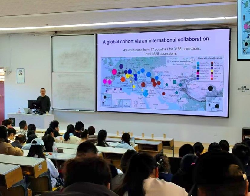 讲座以古希腊神话中的酒神狄俄尼索斯为引,将葡萄的传奇故事与现实世界的葡萄进化与驯化相结合。陈玮教授从遗传学的视角,深入解析了葡萄在历史长河中演变的根本机制,以及人类和环境在其进化和驯化中发挥的重要作用。他详细讲述了葡萄从野生状态到多样化栽培品种的转变,揭示了地球环境变化导致葡萄群体的分化及进化,带领师生们领略了一场穿越时空的葡萄驯化之旅。